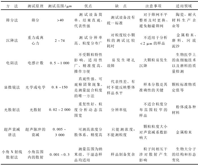 顆粒的大小和尺寸分布參數(shù)與顆粒的特性密切相關(guān),同時(shí)也是顆粒材料的生產(chǎn)制備以及應(yīng)用中離不開的一個(gè)重要環(huán)節(jié)。目前,國(guó)內(nèi)外對(duì)顆粒測(cè)試技術(shù)進(jìn)行深入研究并不斷取得進(jìn)展。顆粒測(cè)試技術(shù)是對(duì)顆粒粒度及其分布等參數(shù)進(jìn)行表征的不同顆粒測(cè)試方法的統(tǒng)稱,依據(jù)原理不同主要包括篩分法、沉降法、電阻法、顯微鏡法、光散射法、超聲衰減譜法及小角X射線散射法。其中粒度,即顆粒尺寸大小是顆粒測(cè)試技術(shù)表征顆粒主要參數(shù),顆粒按粒度大小分為納米顆粒、亞微米顆粒、微粒、微粉、細(xì)粒、細(xì)粉和粗粒。基于不同原理的顆粒測(cè)試方法采用不同等效參考量 (即等效粒度) 進(jìn)行顆粒表征。