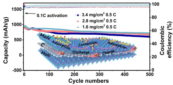 即使宿主骨架的比表面積低(97 m2/g),吸附/催化平面的最大程度的暴露使得MoN-C@S電極在高S負載(75.7 wt%)和1C(1C = 1672 mA/g)倍率下仍可穩(wěn)定循環(huán)至少1000圈,且每圈容量衰減率僅為0.033%,即使在4C高倍率下比容量也可維持在515 mAh/g。將S含量增加到3.4 mg/cm2后,這種三層結構的緊致硫宿主仍然表現出良好的導電性,在500圈循環(huán)后其容量仍能保持在604 mAh/g。這種催化和導電功能之間的協(xié)同工作模式保證了S/Li2Sx的均勻沉積,避免了它們在高倍率和長時間循環(huán)后的電極厚化和失活(電極鈍化)。該工作報道的螯合-氨化方法為C和MoN相的有序分離和面-面接觸提供了保證,也為二維氮化物的制備提供了新的合成方法。