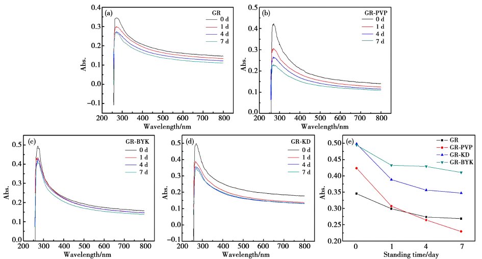 制備出GR-PVP、GR-KD、GR-BYK四種石墨烯漿料后,分別在靜置0d、1d、4d、7d時進(jìn)行紫外吸收光譜測試。四種漿料靜置不同時間的紫外吸收光譜如圖所示: