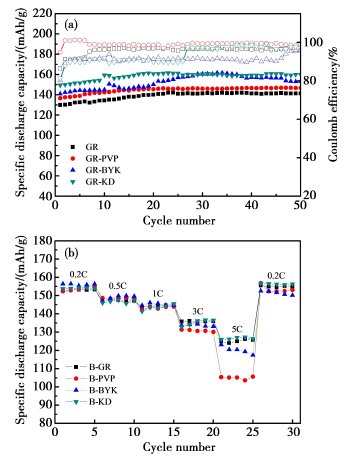 以KD1和BYK-2150作為石墨烯的分散劑,結(jié)合砂磨和超聲分散等物理手段,從而獲得質(zhì)量分?jǐn)?shù)為1%的石墨烯導(dǎo)電漿料。測試表明石墨烯漿料的分散濃度和穩(wěn)定性均有所提高。以磷酸鐵鋰為正極材料,GR-KD和GR-BYK為導(dǎo)電漿料制備的扣式電池在0.2C倍率下的首次放電比容量分別為150.7mAh/g和156.1mAh/g,首次放電效率分別為94.4%和97.7%;在1C倍率下循環(huán)50次后,比容量保持在152.5mAh/g和159.7mAh/g,且GR-KD表現(xiàn)出良好的倍率性能。