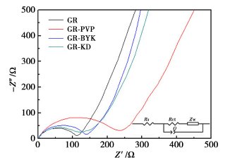 分別向預(yù)處理的PVP、KD1、BYK-2150分散劑溶液中加入石墨烯,經(jīng)過再處理后獲得石墨烯和分散劑含量均為1%的導(dǎo)電漿料。分別命名為GR-PVP、GR-KD、GR-BYK。另外,在不加任何分散劑的情況下,采用相同的步驟配制出質(zhì)量分?jǐn)?shù)為1%的石墨烯漿料作為對比該漿料命名為GR。
