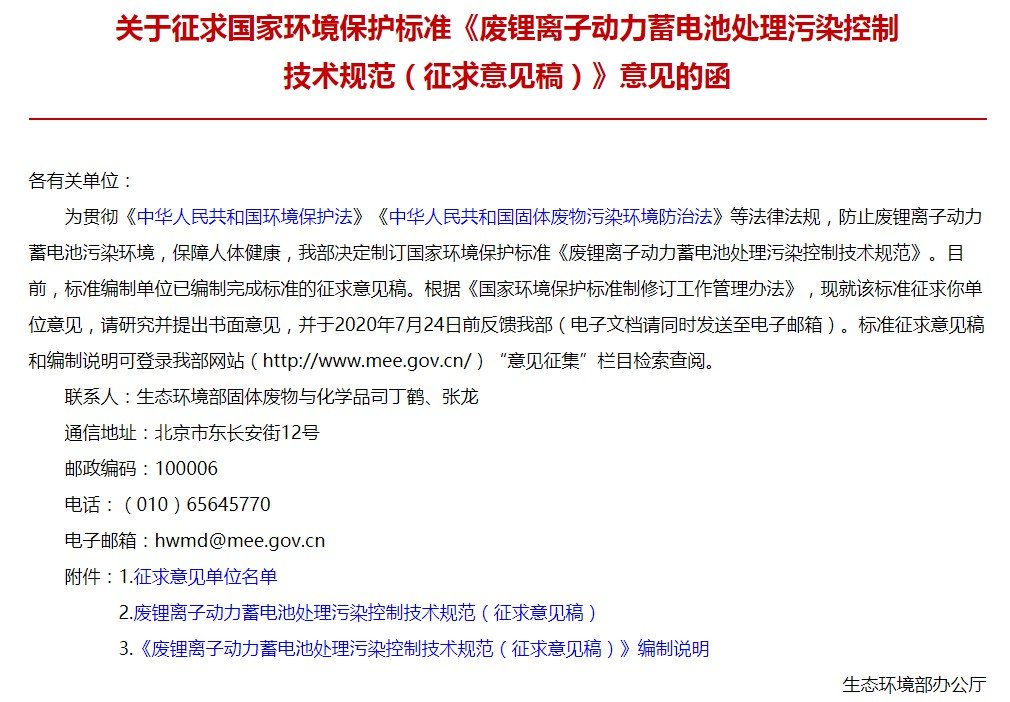 中國粉體網(wǎng)訊 近期,生態(tài)環(huán)境部發(fā)布了《廢鋰離子動力蓄電池處理污染控制技術規(guī)范(征求意見稿)》,其中明確規(guī)定了廢鋰離子動力蓄電池拆解、焙燒、破碎、分選和材料回收過程的污染控制技術要求、運行環(huán)境管理要求和環(huán)境應急管理要求。