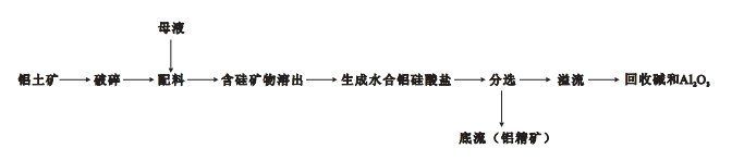 氫氧化鈉直接溶出-分選法是根據(jù)高嶺石和一水硬鋁石在NaOH溶液中溶解特點(diǎn)的不同以及水合鋁硅酸鈉與一水硬鋁石顆粒在粒度、密度和復(fù)合場(chǎng)中的行為的差異而實(shí)現(xiàn)鋁硅分離的一種化學(xué)脫硅法。其工藝主要包括粉碎、含硅礦物溶出和分選等。其脫硅的原則流程如下圖所示。
