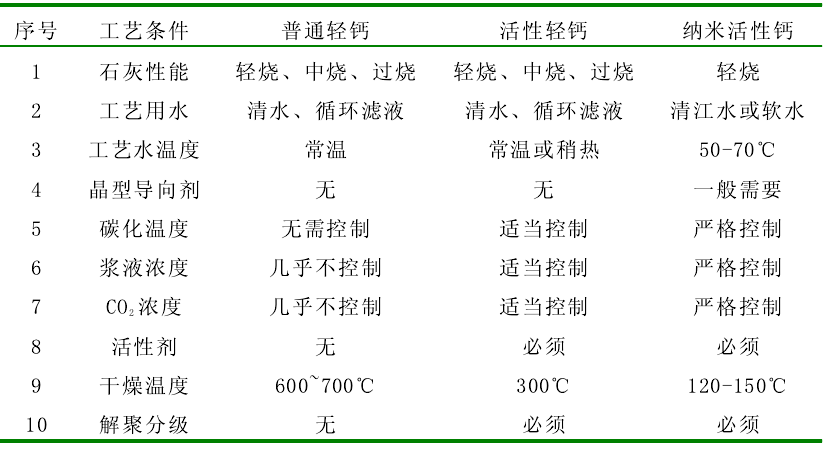 對(duì)普通輕鈣、活性輕鈣和活性納米鈣的工藝條件比較