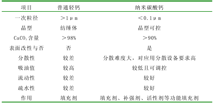 綜上可見,納米碳酸鈣與普通輕質(zhì)碳酸鈣不僅表現(xiàn)在碳酸鈣粒子大小的的差別,還表現(xiàn)在是否進(jìn)行表面改性、晶型是否可控、CaCO3含量高低、分散性優(yōu)劣、吸油值高低、流動(dòng)性和疏水性的優(yōu)劣等;二者在應(yīng)用方面的差別主要表現(xiàn)為所起的宏觀作用不同,普通輕鈣只能起填充劑作用,而納米碳酸鈣除了起填充劑作用外,補(bǔ)強(qiáng)作用、改性作用才是其真正價(jià)值的體現(xiàn)。