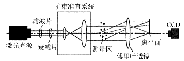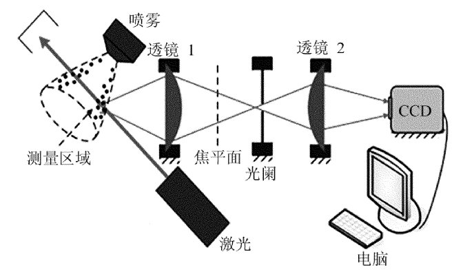 平行光束進(jìn)入霧場(chǎng)會(huì)發(fā)生“光的顆粒散射”現(xiàn)象,在實(shí)際霧場(chǎng)中的散射光場(chǎng)測(cè)量值是眾多顆粒散射光相干疊加的結(jié)果。顆粒直徑不同,其散射光在焦平面的位置也不同。小顆粒產(chǎn)生的散射光夾角大,大顆粒產(chǎn)生的散射光夾角小。且散射光強(qiáng)度與顆粒尺寸也有關(guān)系,散射光強(qiáng)度可反映霧場(chǎng)中相同大小的顆粒所占比例。