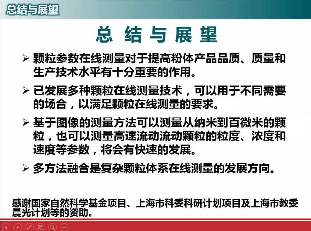 最后,蔡小舒教授進(jìn)行了總結(jié)和展望,表明了顆粒參數(shù)在線測(cè)量的重要性以及在線測(cè)量的發(fā)展方向,為本次粉體粒度表征及在線檢測(cè)技術(shù)網(wǎng)絡(luò)研討會(huì)畫上了圓滿的句點(diǎn)。