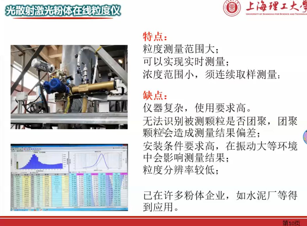 蔡小舒教授闡述了光散射激光粉體在線粒度儀的特點(diǎn)、缺點(diǎn)及應(yīng)用范圍。光散射激光粉體在線粒度儀的特點(diǎn)是粒度測(cè)量范圍大;可以實(shí)現(xiàn)實(shí)時(shí)測(cè)量;濃度范圍小,必須取樣測(cè)量。其缺點(diǎn)則是儀器復(fù)雜,使用要求高;無(wú)法識(shí)別被測(cè)顆粒是否團(tuán)聚,團(tuán)聚顆粒會(huì)造成測(cè)量結(jié)果偏差;安裝條件要求高,在振動(dòng)大等環(huán)境會(huì)影響測(cè)量結(jié)果;粒度分辨率較低。光散射激光粉體在線粒度儀已經(jīng)在許多粉體企業(yè),如水泥廠等得到應(yīng)用。