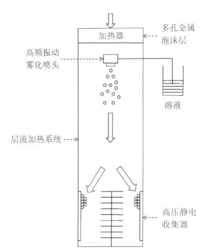 納米噴霧干燥裝置包括高頻振動(dòng)霧化噴頭、層流加熱系統(tǒng)及高壓靜電收集器。納米噴霧干燥儀通過壓電陶瓷驅(qū)動(dòng)多孔金屬膜片(孔徑為4、5.5和7μm)高頻上下振動(dòng),將料液從微孔中噴出形成具有精確大小的微滴氣霧進(jìn)入熱干燥氣體中。