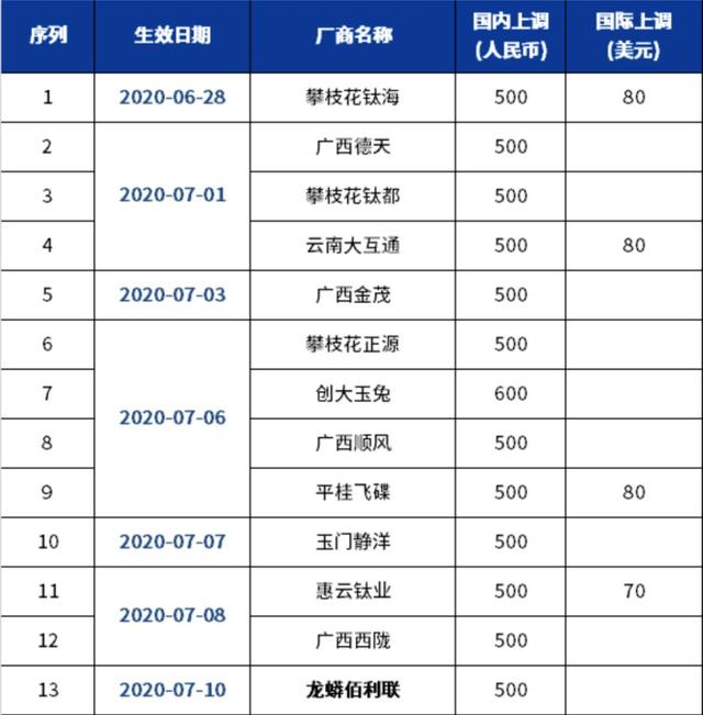 最近,國內(nèi)鈦白粉行業(yè)又掀起了一股漲價浪潮!6月28日,攀枝花鈦?萍悸氏刃紳q價,隨后,廣西德天、攀枝花鈦都、廣西順風等先后調(diào)漲,漲幅均為500元/噸,云南大互通、平桂飛碟還將海外市場價格上調(diào)80美元/噸。截止日前,已經(jīng)有13家鈦白粉公司宣布漲價,國內(nèi)方面價格都在500元/噸,國際市場上則是70美元/噸或80美元/噸。