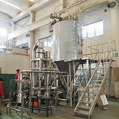 中藥浸膏是由植物根莖葉提取而成,特別是醇提工藝,它含糖份較高,在高溫下易軟化熔融,普通的離心噴霧已無(wú)法滿足干燥,針對(duì)這種情況我公司組織了一批精干的技術(shù)力量,總結(jié)出幾年來(lái)本廠設(shè)計(jì)制造噴霧干燥機(jī)的成功經(jīng)驗(yàn),收集了國(guó)內(nèi)外同行業(yè)同類型產(chǎn)品的優(yōu)點(diǎn),經(jīng)過(guò)精密、反復(fù)的工藝計(jì)算和無(wú)數(shù)次的實(shí)驗(yàn),開(kāi)發(fā)出了中藥專用噴霧干燥機(jī)組,并推廣到了一些知名藥廠使用。