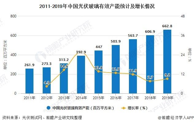 2011-2019年中國光伏玻璃有效產(chǎn)能統(tǒng)計及增長情況