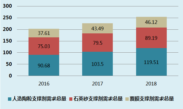 2016-2018年我國(guó)不同類型壓裂支撐劑需求總量統(tǒng)計(jì)(單位:萬噸)