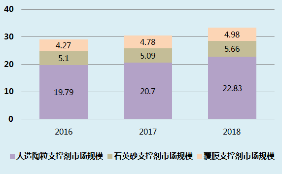 2016-2018年我國(guó)不同類型壓裂支撐劑規(guī)模情況(單位:億元)