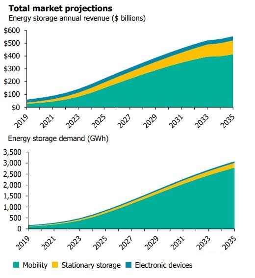 Lux Research發(fā)布了一份名為“Global Energy Storage Market Forecast 2019”的報告,預(yù)測未來15年,全球儲能市場裝機容量將以更快的速度增長,到2035年,累計裝機規(guī)模將達到3046GWh,年復(fù)合增長率為20%,年收入將達到5460億美元,年復(fù)合增長率為14.9%。