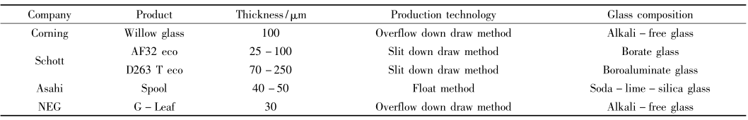 從柔性玻璃技術(shù)開發(fā)情況來看,國(guó)外康寧、肖特、旭硝子、電氣硝子等玻璃巨頭公司已掌握了柔性玻璃全套生產(chǎn)技術(shù),例如:2011年康寧公司采用溢流下拉法試制出柔性玻璃,2014年旭硝子采用浮法試驗(yàn)線研發(fā)柔性玻璃,2014年肖特公司利用窄縫下拉法試制25~100μm柔性玻璃等。