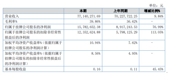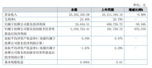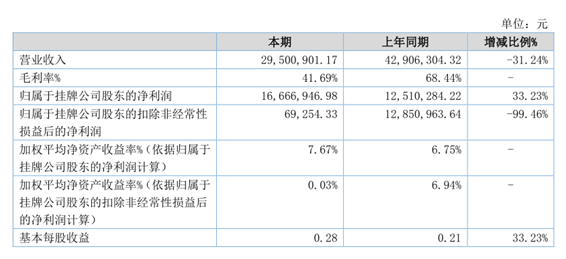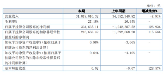 群鑫科技(834008)2020年半年度報告顯示,截止2020年6月30日,2020年上半年公司實現(xiàn)營業(yè)收入31,819,010.32元,同比下滑7.91%;實現(xiàn)歸屬于掛牌公司股東的凈利潤334,635.11元,較上年同期扭虧為盈。