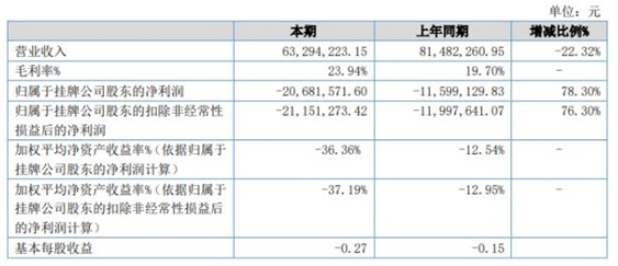 蘭花納米(839189)2020年半年度報告顯示,截止2020年6月30日,2020年上半年公司實現(xiàn)營業(yè)收入63,294,223.15元,同比下滑22.32%;實現(xiàn)歸屬于掛牌公司股東的凈利潤-20,681,571.60元,較上年同期虧損程度有所增加。