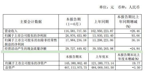 五峰材料(871883)2020年半年度報告顯示,2020年上半年公司實現(xiàn)營業(yè)收入25,292,320.08元,同比減少0.86%;實現(xiàn)歸屬于掛牌公司股東的凈利潤24,654.51元,同比減少95.94%。