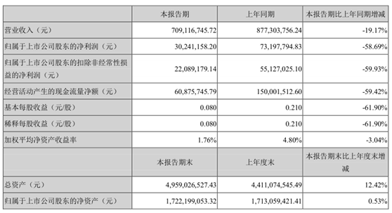 凱龍股份2020年上半年歸屬于上市公司股東的凈利潤約為3024萬元,同比下降58.69%,營業(yè)收入約為7.09億元,同比下降19.17%,基本每股收益盈利0.080元,同比下降61.9%。