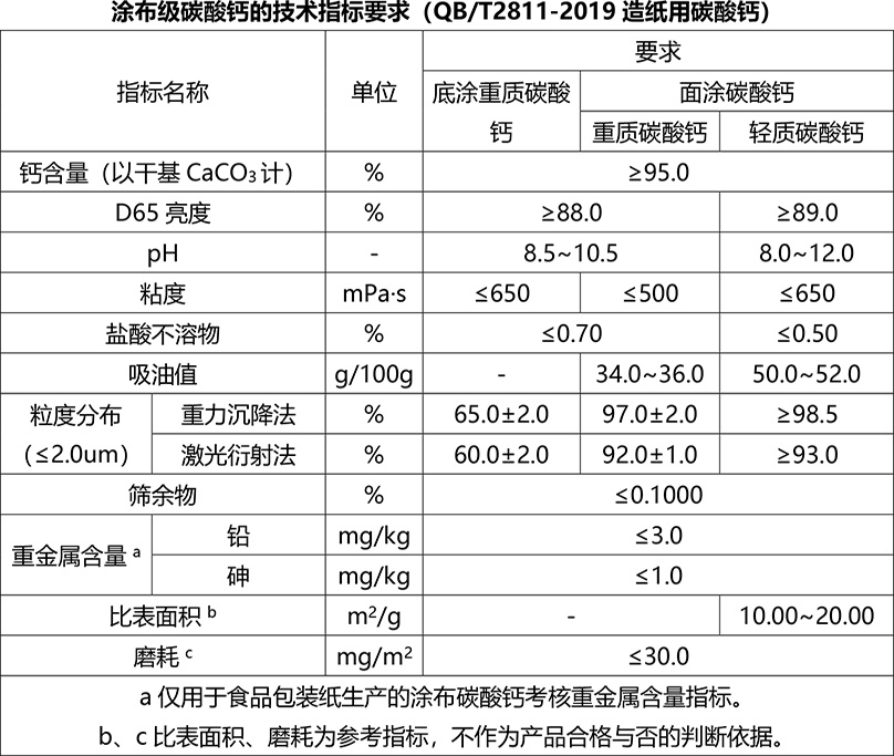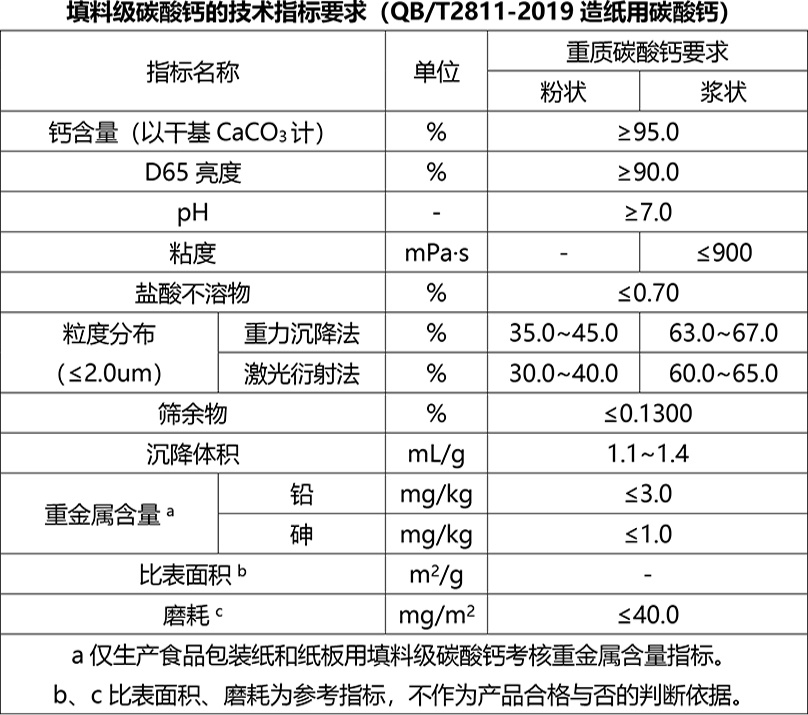 2020年4月1日,QB/T2811-2019造紙用碳酸鈣代替QB/T2811-2006造紙研磨碳酸鈣正式實(shí)施。依據(jù)標(biāo)準(zhǔn),造紙用碳酸鈣按產(chǎn)品用途分為填料級(jí)碳酸鈣、涂布級(jí)碳酸鈣。其中填料級(jí)碳酸鈣包括重質(zhì)碳酸鈣(研磨碳酸鈣)和輕質(zhì)碳酸鈣(沉淀碳酸鈣),涂布級(jí)碳酸鈣包括底涂碳酸鈣和面涂碳酸鈣。此外,造紙用碳酸鈣按產(chǎn)品形式可分為:粉狀碳酸鈣、膏狀碳酸鈣和漿狀碳酸鈣。