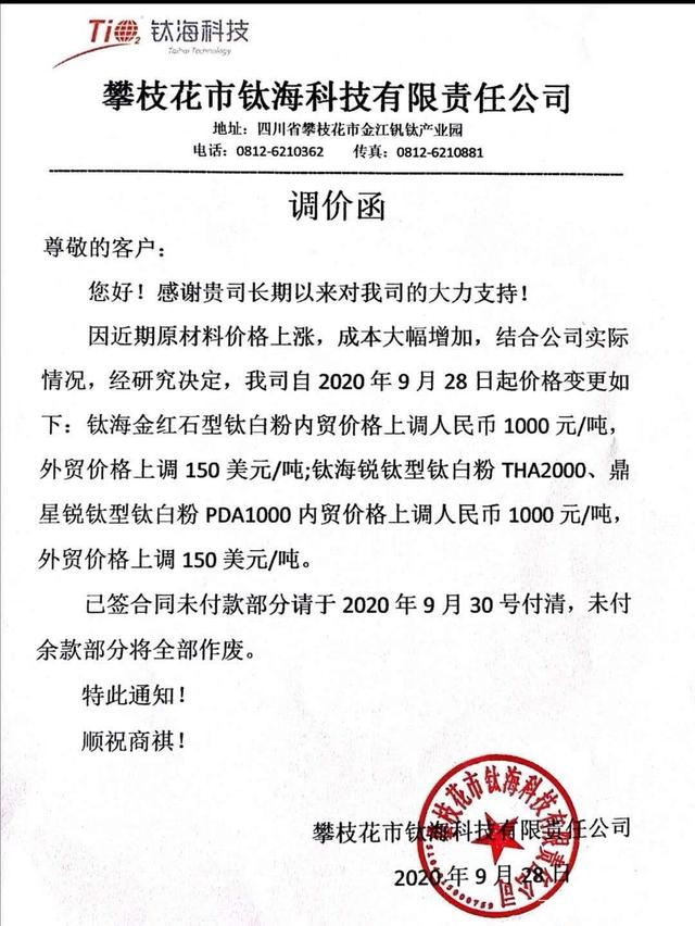 中國(guó)粉體網(wǎng)訊 2020年9月28日,攀枝花鈦?萍加邢挢(zé)任公司發(fā)布鈦白粉調(diào)價(jià)函通知;诋(dāng)前的原材料價(jià)格上漲,成本大幅度增加,結(jié)合公司實(shí)際情況,經(jīng)公司研究決定,自即日起,公司鈦海金紅石型鈦白粉國(guó)內(nèi)價(jià)格上調(diào)1000元/噸,國(guó)外價(jià)格上調(diào)150美元/噸。鈦海銳鈦型鈦白粉THA2000、鼎星銳鈦型鈦白粉PDA1000國(guó)內(nèi)價(jià)格1000元/噸,國(guó)外價(jià)格上調(diào)150美元/噸。