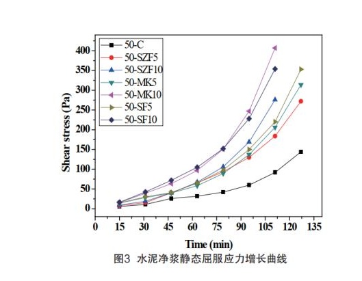 不同配比水泥凈漿靜態(tài)屈服應(yīng)力增長(zhǎng)曲線如圖3。可以看出超細(xì)沸石粉、硅灰和偏高嶺土對(duì)靜態(tài)屈服應(yīng)力影響程度是不同的。靜態(tài)屈服應(yīng)力增長(zhǎng)速率對(duì)應(yīng)于結(jié)構(gòu)構(gòu)筑速率。其中在相同摻量的情況下,硅灰和偏高嶺土結(jié)構(gòu)構(gòu)筑速率大于超細(xì)沸石粉,當(dāng)超細(xì)沸石粉摻量10%時(shí),結(jié)構(gòu)構(gòu)筑速率均高于摻量為5%的硅灰和偏高嶺土。在跟試驗(yàn)中得到的靜態(tài)屈服應(yīng)力增長(zhǎng)速率與Billberg的試驗(yàn)結(jié)果相似。同時(shí)可以看出,在靜態(tài)屈服應(yīng)力測(cè)試前1h內(nèi),應(yīng)力圖像增長(zhǎng)接近線性增長(zhǎng)方式。在1~2.5h內(nèi),增長(zhǎng)曲線解決指數(shù)型增長(zhǎng)模式。這說(shuō)明在前期,水化反應(yīng)較慢,水化反應(yīng)誘導(dǎo)期還未結(jié)束,靜態(tài)屈服應(yīng)力增長(zhǎng)緩慢,接近線性增長(zhǎng)。當(dāng)水化反應(yīng)變快的時(shí)候,靜態(tài)屈服應(yīng)力增長(zhǎng)也隨之加快。
