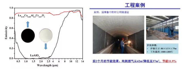 基于半導(dǎo)體能帶理論和能隙調(diào)控機(jī)制,研制成功了具有在近紅外波段具有高紅外發(fā)射率的系列氧化物陶瓷材料。通過(guò)離子摻雜,實(shí)現(xiàn)了對(duì)一系列氧化物陶瓷材料的“顛倒黑白”,使其近紅外波段發(fā)射率提高到接近黑體的程度(提高8倍以上)。其工程意義在于:以之制成的高發(fā)射率涂層,可大幅度強(qiáng)化高溫爐窯中的輻射傳熱,從而使實(shí)現(xiàn)10%的節(jié)能,這對(duì)于高溫工業(yè)裝備的節(jié)能減排意義重大。