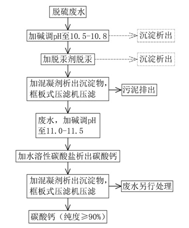摘要:本發(fā)明公開了一種以濕法脫硫廢水為原料的碳酸鈣制備方法,其技術方案要點是包括如下步驟:P1、調pH至10.5 10.8;P2、加入有機硫化物除汞;P3、加入混凝劑混合均勻后進行固液分離去除析出沉淀物;P4、調pH至11.0 11.5;P5、加入水溶性碳酸鹽,析出碳酸鈣;P6、加入混凝劑混合均勻后進行固液分離,得碳酸鈣。本發(fā)明的碳酸鈣制備方法具有環(huán)保、生產成本低的優(yōu)勢。本發(fā)明還相應公開了一種脫硫廢水處理工藝,包括堿化、除汞、絮凝除雜、堿化、碳酸鈣析出、固液分離等步驟,不僅有效降低了廢水中污染物濃度、且降低了總污泥排放量和藥劑費用,處理后廢液符合行業(yè)標準且實現(xiàn)了脫硫廢水中碳酸鈣的回收再利用,具有極佳的環(huán)保價值和經濟效益,適于推廣應用。