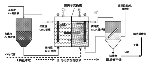 摘要:本發(fā)明提出一種原位電化學沉淀技術制備納米碳酸鈣的方法,以氯化鈣溶液為原料,采用微電解系統(tǒng)進行電解反應,利用陽離子交換膜的選擇性鈣離子遷移,在陰極室獲得高純氫氧化鈣懸浮液,以含CO2氣體為碳化劑,在晶型控制劑、分散劑的協(xié)同作用下,將氫氧化鈣懸浮液碳化結晶形成穩(wěn)定納米級碳酸鈣粒子,再經分離干燥制得納米碳酸鈣終產品。陽極室形成的氯循環(huán)回到上游濕法萃取工藝進行利用,陰極室產生的氫逸出收集純化可得高純氫氣。本發(fā)明解決礦山尾礦石或大理石邊角剩余物的回收利用問題,是實現(xiàn)“重質碳酸鈣回收—鈣質純化—制備納米碳酸鈣”重要手段,無高溫煅燒、利用清潔能源、CO2實現(xiàn)生態(tài)內循環(huán),是一種高效清潔生產納米級粉體材料的方法。