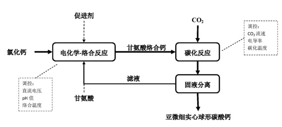 摘要:本發(fā)明提出一種氯化鈣制備亞微細實心球形碳酸鈣的方法,該方法以氯化鈣溶液為原料,采用電化學 絡合反應技術制備甘氨酸絡合鈣,再經與CO2發(fā)生碳化反應獲得亞微細實心球形碳酸鈣。方法中主要通過控制直流電壓、絡合反應溫度、絡合反應pH值、碳化反應溫度、CO2流速、碳化電導率等條件來實現(xiàn)制備亞微細實心球形碳酸鈣,本發(fā)明解決了礦山尾礦石或大理石邊角剩余物的回收利用問題,是實現(xiàn)“重質碳酸鈣回收——鈣質純化——制備功能化碳酸鈣”重要手段,主要特點是利用廢棄剩余物、無高溫煅燒、利用清潔能源、CO2實現(xiàn)生態(tài)內循環(huán),是一種清潔生產亞微細實心球形碳酸鈣粉體材料的方法。實現(xiàn)碳酸鈣產業(yè)的高效綜合利用,并解決制約碳酸鈣產業(yè)發(fā)展的生態(tài)環(huán)保問題。