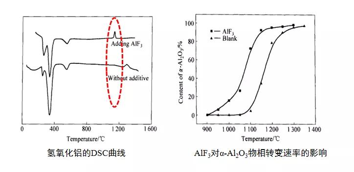 以AlF3為例,將氫氧化鋁與AlF3混合、高溫煅燒制備α-Al2O3。高溫煅燒過(guò)程中加入AlF3后,氧化鋁相變溫度從1300℃降低至1150℃。