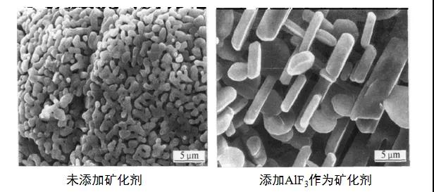 可以看出,未添加礦化劑所得α-A2O3是類似于蠕蟲(chóng)狀,添加AlF3作為礦化劑可得片狀α-A2O3,且晶粒較大。