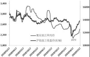圖.氧化鋁三網(wǎng)現(xiàn)貨均價及鋁價格(元/噸)