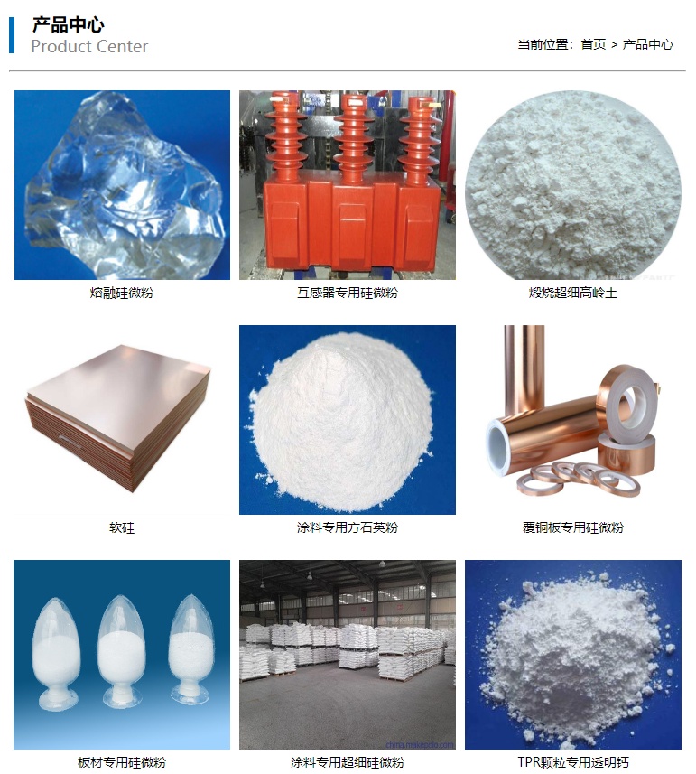 主要產(chǎn)品:方石英粉,球形硅微粉,氫氧化鎂阻燃劑,透明鈣,涂料專用煅燒高嶺土,結(jié)晶硅微粉,熔融硅微粉,活性硅微粉,AGP工藝專用硅微粉,硅橡膠專用硅微粉,超細(xì)硅微粉,石英砂,電熔砂,高純砂。