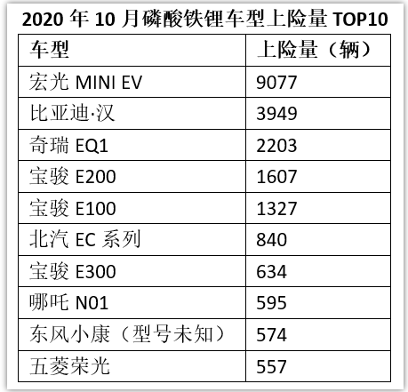 前10款磷酸鐵鋰配套車(chē)型分別為比亞迪·漢、宏光MINI EV、奇瑞EQ1、寶駿E200、寶駿E100、北汽EC系列、寶駿E300、哪吒N01、東風(fēng)小康C36和五菱榮光。