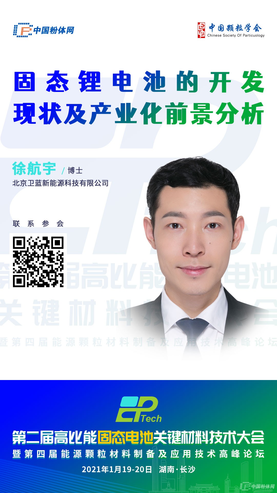 2021年3月11-12日,由中國(guó)粉體網(wǎng)、中國(guó)顆粒學(xué)會(huì)能源顆粒材料專委會(huì)主辦,長(zhǎng)沙礦冶研究院先進(jìn)材料研究所協(xié)辦的第二屆高比能固態(tài)電池關(guān)鍵材料技術(shù)大會(huì)將在長(zhǎng)沙吉美國(guó)際會(huì)展酒店隆重舉行,屆時(shí),北京衛(wèi)藍(lán)新能源科技有限公司徐航宇博士將帶來報(bào)告《固態(tài)鋰電池的開發(fā)現(xiàn)狀及產(chǎn)業(yè)化前景分析》,與參會(huì)嘉賓分享相關(guān)研究成果。