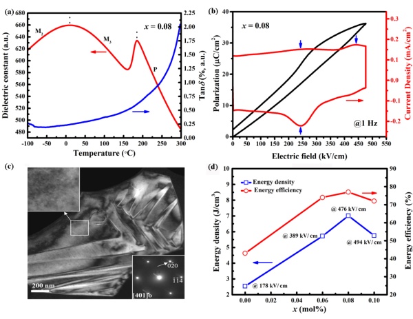 圖1.Ag0.76La0.08NbO3陶瓷的(a)介電溫譜(b)反鐵電性能(c)疇形貌和(d)儲能性能