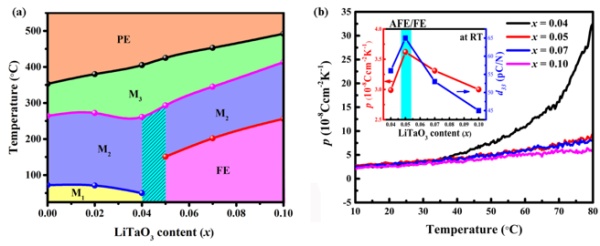 圖2.(1-x)AgNbO3-LiTaO3陶瓷(a)組分-溫度相圖和(b)熱釋電系數(shù)隨溫度變化曲線