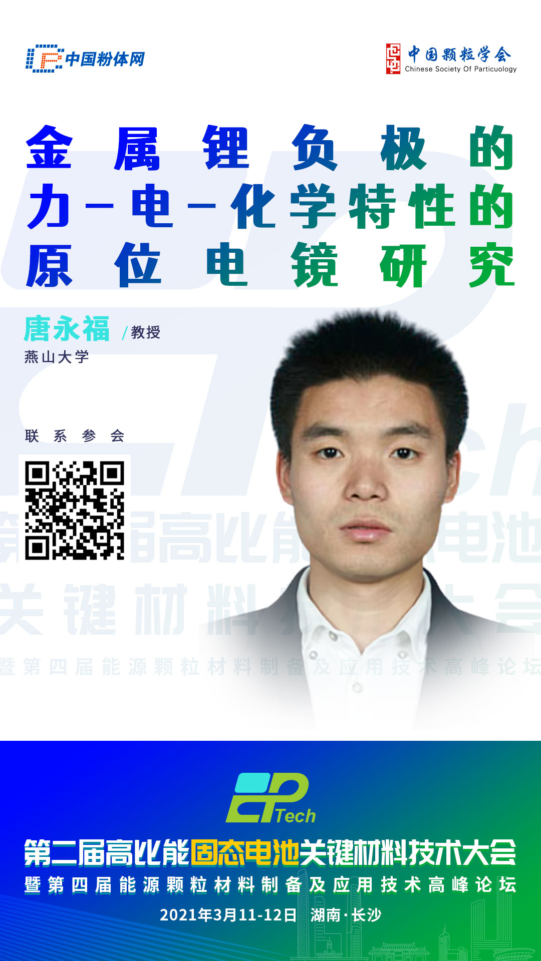 2021年3月11-12日,由中國粉體網(wǎng)、中國顆粒學會能源顆粒材料專委會主辦,長沙礦冶研究院先進材料研究所協(xié)辦的第二屆高比能固態(tài)電池關鍵材料技術大會將在長沙吉美國際會展酒店隆重舉行,屆時,唐永福教授將帶來報告《金屬鋰負極的力-電-化學特性的原位電鏡研究》,與參會嘉賓分享相關研究成果。