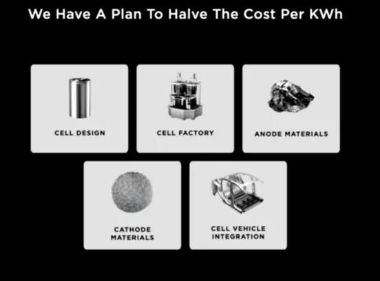 2020年特斯拉的「電池日」,宣布了從電芯設(shè)計(jì)、電芯生產(chǎn)工藝、硅負(fù)極材料、高鎳正極材料、電芯車輛集成化5各方面開發(fā)電池,最終,馬斯克認(rèn)為這個(gè)方案能使電池成本減少56%,續(xù)航里程增加54%,單位投資額減少69%。