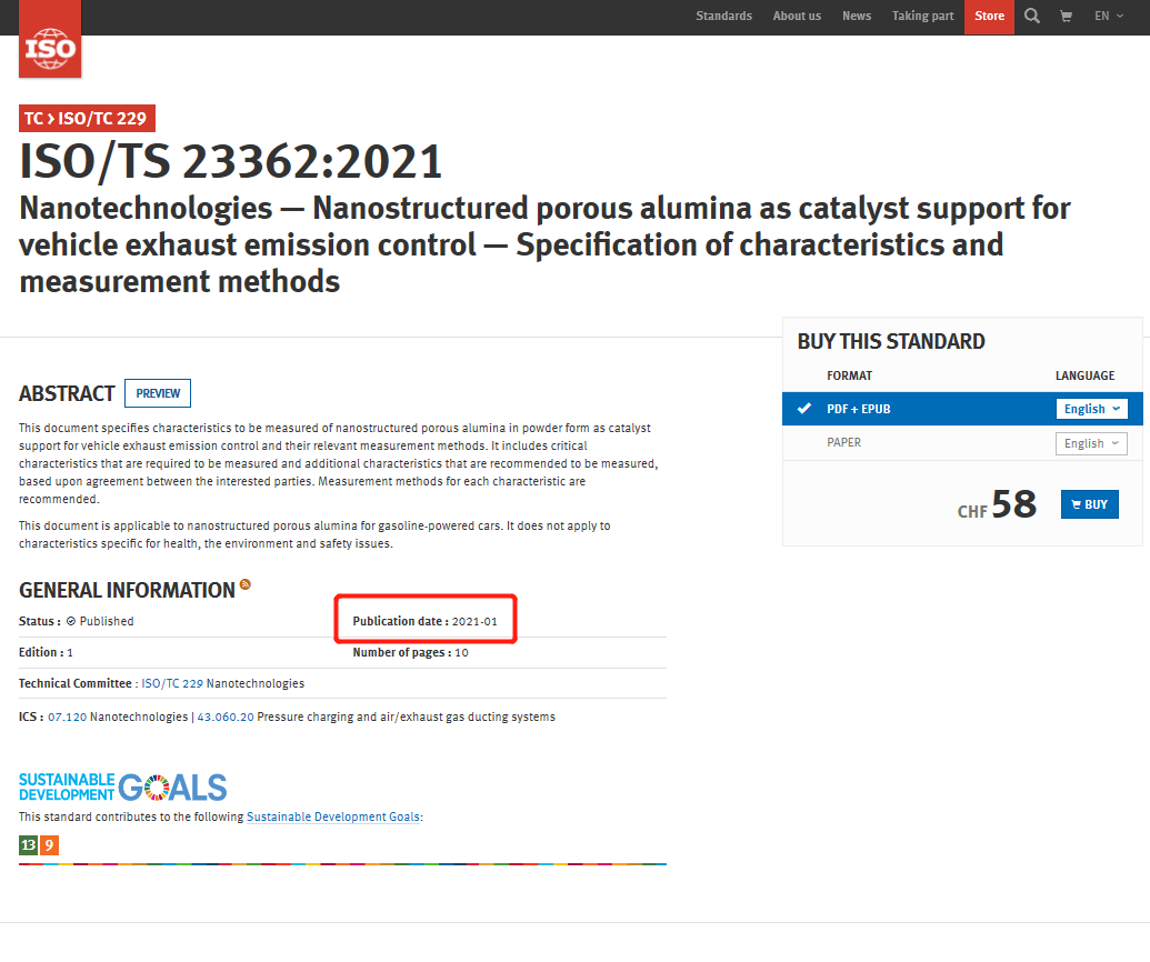 中國粉體網(wǎng)訊 2021年1月10日,ISO/TS 23362:2021“催化劑載體用納米氧化鋁”國際標準經(jīng)國際標準化組織納米技術(shù)委員會(ISO/TC229)正式批準,出版實施。該國際標準2018年4月由上海國瓷牽頭,歷時3年,經(jīng)立項、起草、征求意見、審查、批準以及出版階段等制定過程,獲得發(fā)布實施,該標準是國瓷主持的首個國際標準,同時也是國內(nèi)制定的第一個針對汽車尾氣催化劑載體用納米氧化鋁技術(shù)評價的國際標準,填補了該產(chǎn)品中國國際標準制修訂領(lǐng)域的空白。