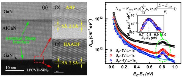 中國粉體網(wǎng)訊 近日,中國科學(xué)院微電子研究所高頻高壓中心研究員劉新宇團隊等在GaN界面態(tài)研究領(lǐng)域取得進展,在LPCVD-SiNx/GaN界面獲得原子級平整界面和國際先進水平的界面態(tài)特性,提出了適用于較寬能量范圍的界面態(tài)U型分布函數(shù),實現(xiàn)了離散能級與界面態(tài)的分離。