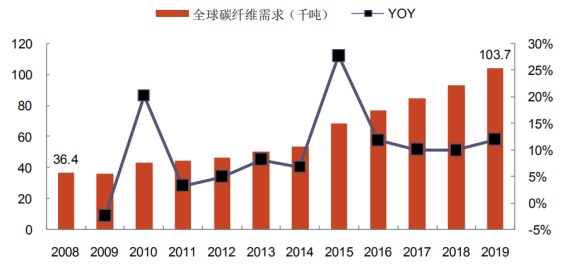 全球碳纖維市場需求量長期持續(xù)增長,由2008年的3.6萬噸增長至2019年的10.4萬噸,CAGR10%,2016-2019年增速有所提升,保持在10%-12%之間,2019年同比增長12%。
