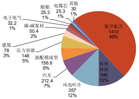 2019年全球碳纖維市場為28.70億美元,同比增長11.64%。各應(yīng)用領(lǐng)域碳纖維價值總量方面,應(yīng)用于航空航天領(lǐng)域的碳纖維由于要求較高,價值總量占比達到49%,平均單價達到約60美元/kg,均明顯高于其他領(lǐng)域。