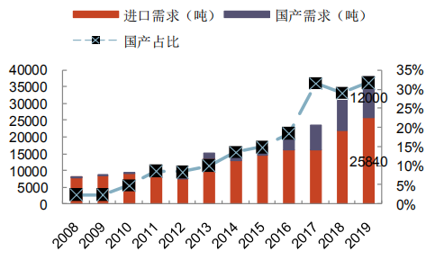 國內(nèi)碳纖維市場需求量增長速度,由2008年的8200噸增長至2019年的37840噸,CAGR14.9%,2017-2019年同比保持20%以上增長,增速明顯高于全球平均水平。國內(nèi)2019年消費的37840噸碳纖維中,國產(chǎn)產(chǎn)品為12000噸,仍有25840噸即總量的2/3以上的碳纖維需要進口,國內(nèi)碳纖維市場規(guī)模達到8.24億美元,同比增長15.96%。