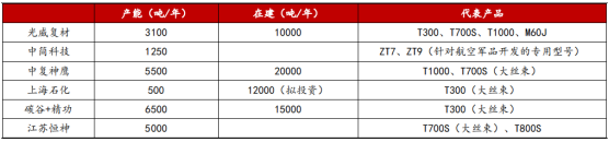 我國碳纖維生產(chǎn)企業(yè)產(chǎn)能及在建產(chǎn)能