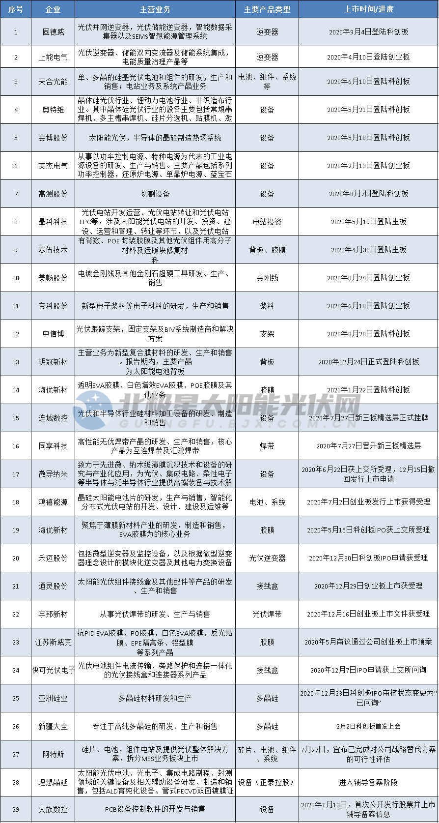 據北極星太陽能光伏網統(tǒng)計,從2020年初到目前為止,短短的一年時間,就有29家光伏企業(yè)沖刺IPO,其中14家企業(yè)上市成功,2家企業(yè)晉升新三板精選層,12家企業(yè)上市進行中,僅微導納米撤回發(fā)行上市申請。