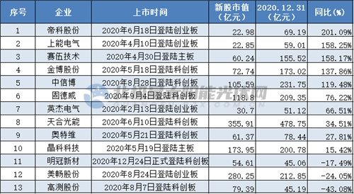 經過北極星太陽能光伏網梳理發(fā)現(xiàn),從各上市企業(yè)登陸資本市場開始到2020年底,表現(xiàn)最亮眼的當屬帝科股份,從6月18日登陸創(chuàng)業(yè)板到年末,市值實現(xiàn)2倍增長,上能電氣、賽伍技術實現(xiàn)1.58倍增長,金博股份實現(xiàn)1.37倍增長。整體來看,將近77%的企業(yè)市值實現(xiàn)了增長,僅明冠新材、美暢股份、高測股份市值出現(xiàn)回落,其中明測股份下降了約43%。