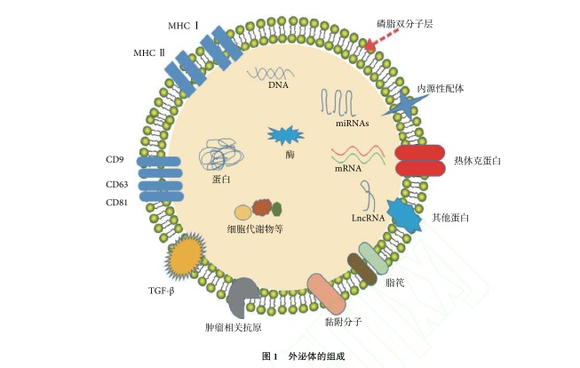 外泌體膜內(nèi)包被各種生物活性分子,是細胞間信號交流的重要介質,更是自身負載大分子物質并參與全身運輸?shù)奶烊惠d體。外泌體內(nèi),含有DNA、miRNAs、mRNA、長鏈非編碼RNA(LncRNA)、酶、蛋白質和細胞代謝物等。除此之外,外泌體膜表面還鑲嵌大量蛋白分子。